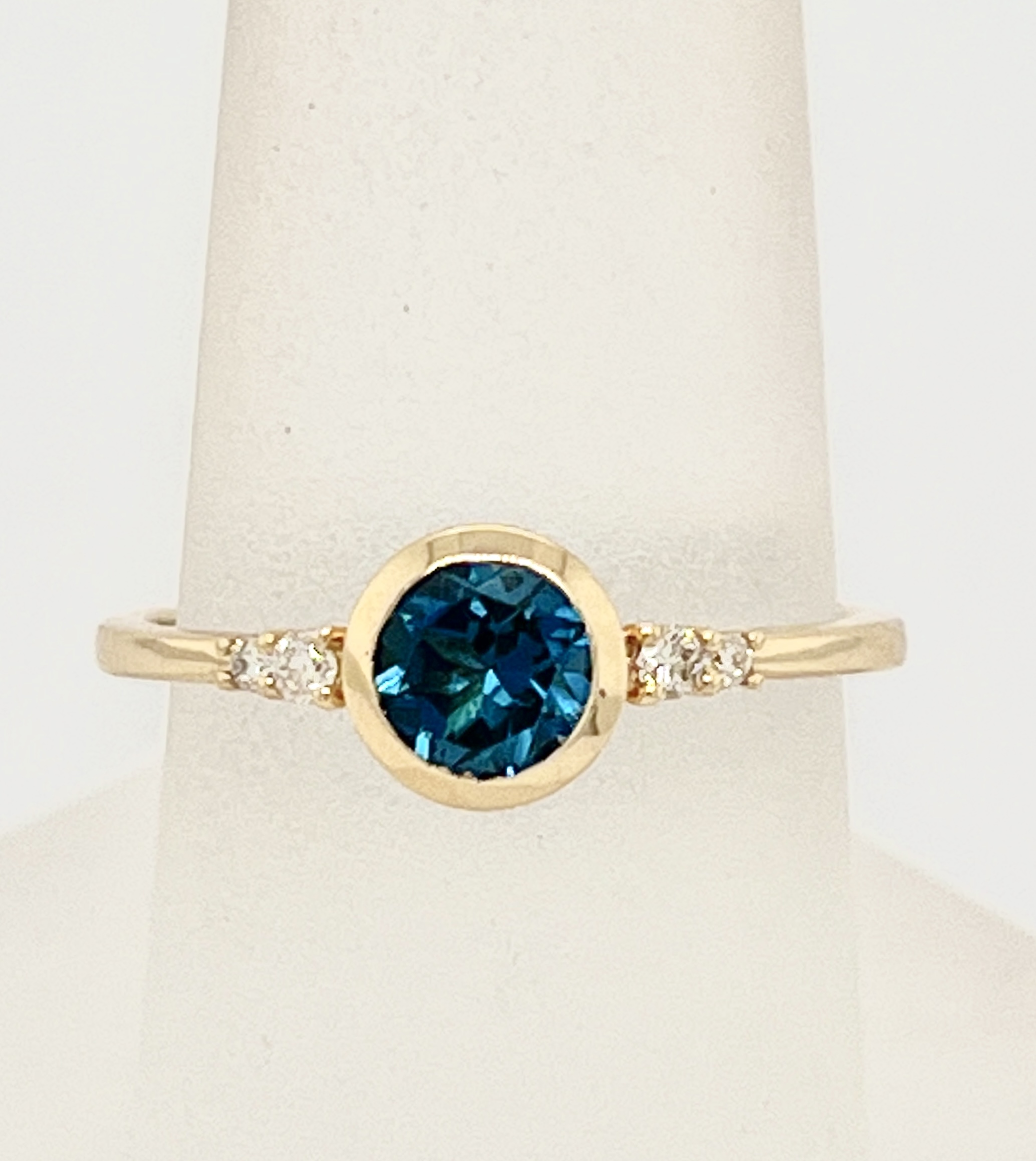 Sweet bezel set London Blue Topaz set in 14k yellow gold with .02tw of diamonds